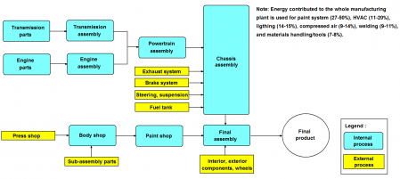 The automotive industry is continuously struggling to reduce the energy consumption of their vehicle manufacturing process. Amongst the facilities of the manufacturing plant, the paint shop is responsible for the highest energy consumption. Fig. 1 shows an example of the whole vehicle manufacturing process and the related energy consumption by sector. The article investigates the possible utilisation of thermo-chemical fluids for temperature and humidity control in the vehicle painting process with waterborne paint of NISSAN UK manufacturer and how these can reduce the energy consumption of the paint shop.