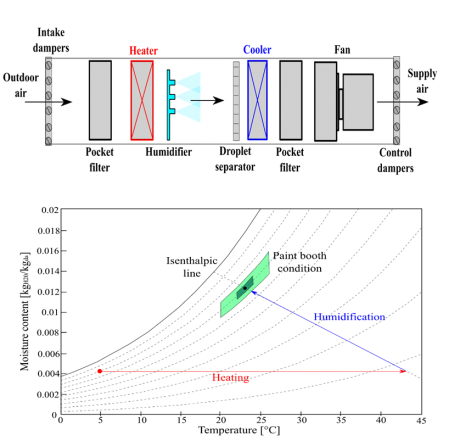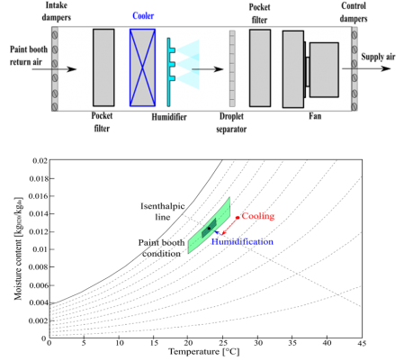 The conventional automotive painting process uses two different air supply units for paint booth supply air: air supply unit (ASU) with 100% outdoor air and air recirculated unit (ARU). Under the NISSAN UK manufacturing plant yearly outdoor air condition, the temperature and humidity required for the optimal quality of the painting process with water-based paint demands heating and humidification of the outdoor air most of the year. A conventional outdoor ASU and the process performed on the psychometric chart are shown in Fig. 3. The outdoor air condition shown is 5°C, 80% RH, while the optimal (dark green) and acceptable (light green) paint booth condition shown in the Figure are 23±1°C, 70±2%RH and 23±3°C, 70±5%RH, respectively.