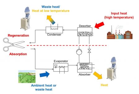 The innovation of H-DisNet is the examination of an open absorption technology in that absorption and desorption do not take place at the same location. It works as an absorption heat pump with the splitting of the absorption side from the desorption sides. This allows to exploit heat sources far away from the location of service as well as time shifts between heat usage and service.
